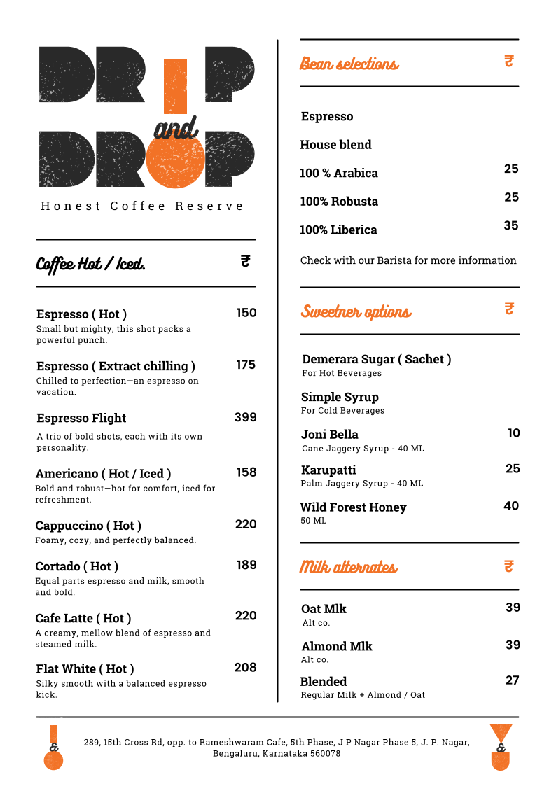 Introducing Drip and Drop Coffee, a vibrant cafe nestled in the heart of J.P. Nagar, Bengaluru. Renowned for its innovative take on coffee, the menu features a stunning array of brews that cater to every palate. From the Cold Brew on The Rocks, crafted over a 48-hour brew, to the unique Rum Barrel Aged Cold Drip made from 100% Arabica beans, each sip is a testament to quality and creativity.